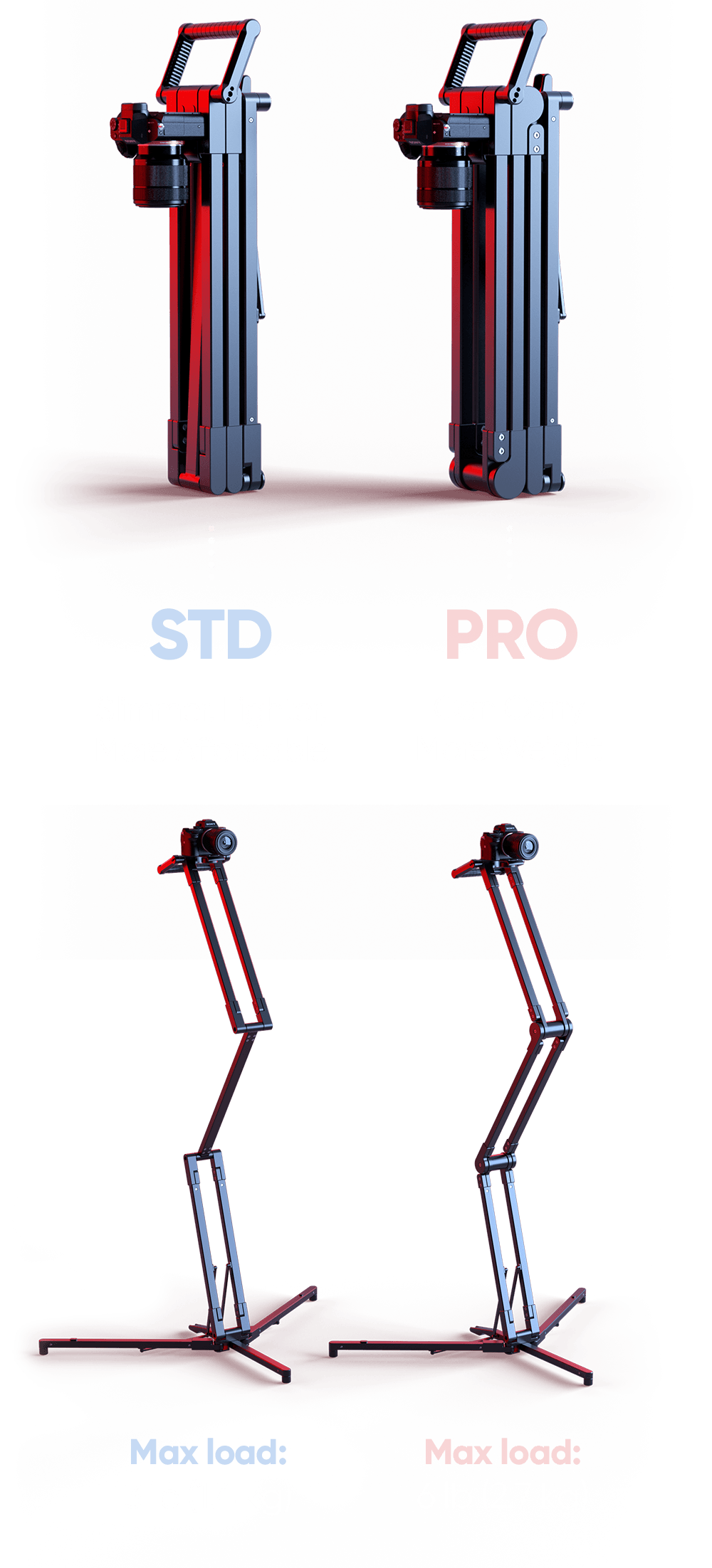 Das Modell „STANDARD“ ist schlanker, leichter und günstiger, während das Modell „PRO“ mehr Gewicht tragen kann. Alle anderen Funktionen bleiben gleich.